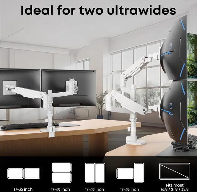 Fully Movment and Vertically Stacked: Its pole-mounted design give your monitor wider moving range tilt, swivel, height adjustable and Vertically Stacked option let you get better viewing experience with two stcacked ultra wide monitors; You could set your monitors to customized angles and positions freely while saving up much valuable space on your desktop