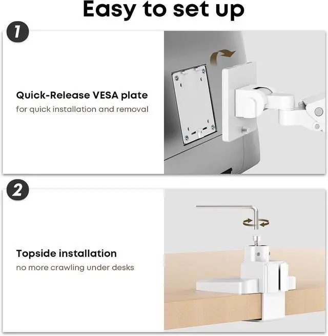 Sturdy Instruction and Easy Assemble: This 2 monitor desk mount is made of aluminum and steel and passed strength weight test through GS/UL witness Lab; The installation steps are very easy and take less time; Please check monitor weight, VESA holes, desktop