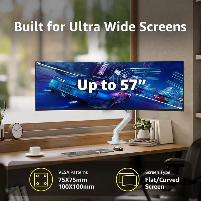 Suit For Ultra Wide Screens: BEWISER Heavy Duty Monitor Arm fits most 34-57 Inch Curved and Flat Screens. Heavy duty monitor arm securely lifts, turnsand tiltsultrawide monitors for an immersive viewing experience for work or gaming. Comes with interchangeable C-clamp or grommet base mount for use on desktops up to 2.4 inches thick.