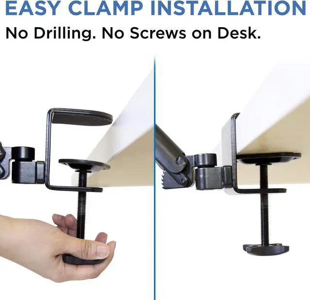 EASY INSTALLATION and no drilling required. This arm support for desk easily attaches to your current desktop with its tool-free clamping base. Fits desk thicknesses between. 3 and 2.63.