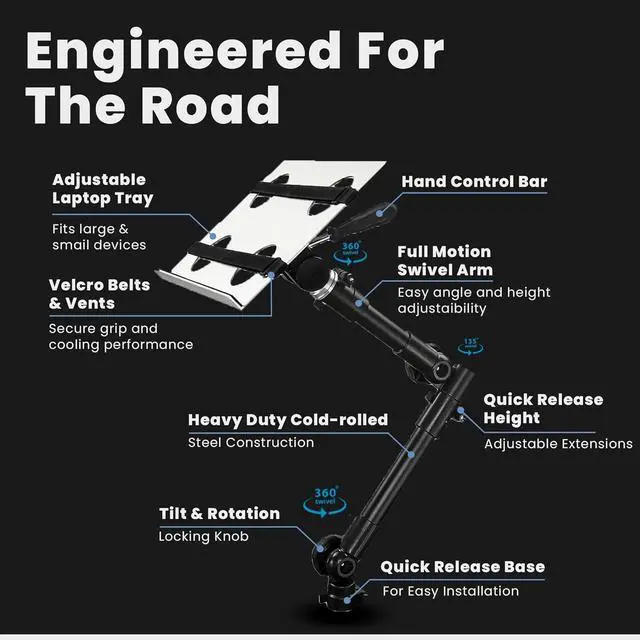 FULL MOTION LAPTOP HOLDER: Find the perfect position for your laptop, tablet or notebook with this car laptop holders full range of motion. Three swivel joints and a height adjustable steel arm allow you to rotate your computer stand a full 360 degrees, tilt it 180 degrees and adjust the height a full 12.5 inches.
