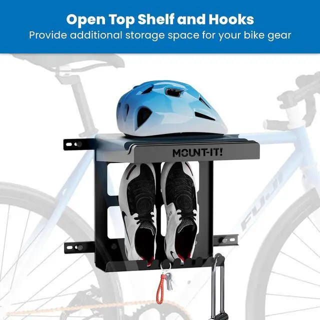 EXTRA STORAGE: This horizontal bike wall mount comes with shelves and built-in hooks that offer an abundance of extra storage for your cycling essentials such as helmet, shoes, lock and keys. Keep your gear organized and ready for your next cycling adventure!