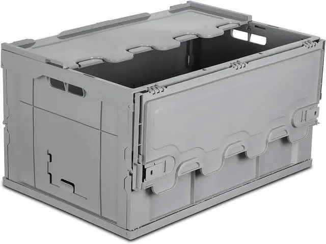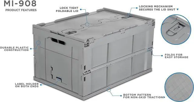 STACKABLE STORAGE. This collapsible bin has a nesting system for secure vertical stacking, dual sliding locks for the top flip cover, and label holders for bin identification