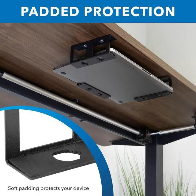 MAXIMIZE DESK SPACE: Store your laptop and other devices under your desk, underneath a shelf or on the wall and free up valuable desk space with this versatile laptop under desk mount. This notebook rack consists of 3 brackets that mount under any table, desk or shelf and can even be used as a laptop wall mount.