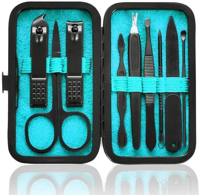 HANTEKAS Professional Manicure Kit Contains 9 pieces nail and toenail tools for three functions must meet what you need, include hand care,facial care,foot care: Nail clippers for finger and toenails, cuticle pusher cleaner, nail file, v-shaped push stick cuticle trimmers, eyebrow tweezers, multi-purpose scissor, blackhead needle with loop remover and ear pick.