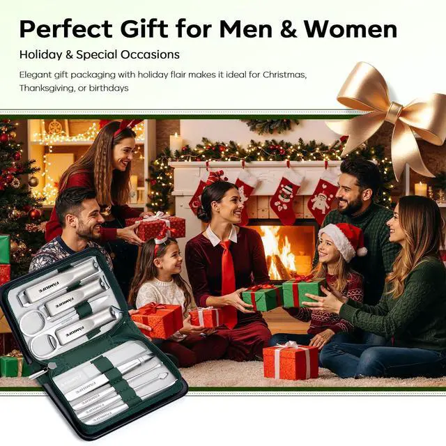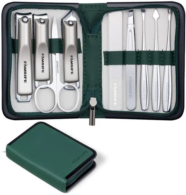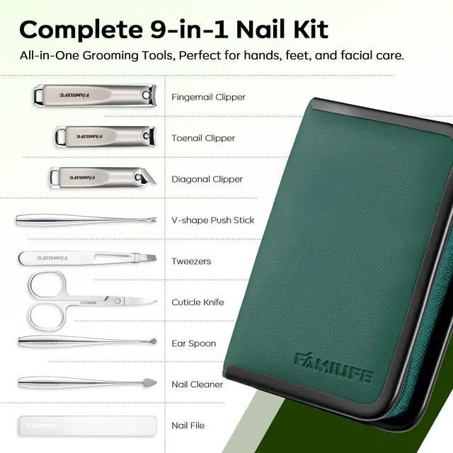 Complete 9-Piece Grooming Solution for Everyday CareOur manicure kit includes 1*fingernail clipper, 1*toenail clipper, 1*diagonal clipper, 1*V-shape push stick, 1*tweezer, 1*cuticle knife, 1*ear spoon, 1*nail cleaner, and 1*nail file. Perfect for daily grooming, travel, or office use, it handles trimming, shaping, cleaning and detailed nail care with ease. Great for both beginners and experienced users who value neat, healthy nails. Not for use by children without adult supervision