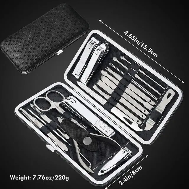 The set includes 19 tools like nail clippers, tweezers, and cuticle cutters, ensuring a complete grooming experience. Each tool is specifically designed for precision and ease of use in personal care.