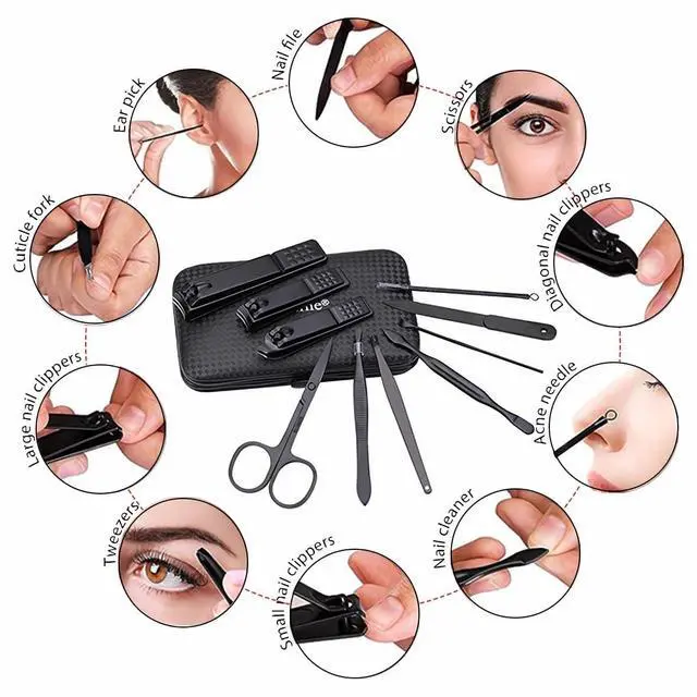 The 10-piece manicure set comes with an elegant black PU case that is beautiful, soft and comfortable. Also prevent the manicure tools from shifting and losing. Made of stainless steel, does not rust and sharp, bring you a good cutting experience, these nail clippers can easily trim hard and thick nails.