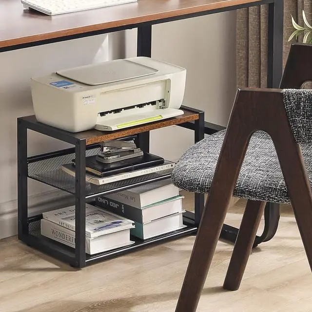 solid structure: this desktop printer shelf is assembled with engineering wood and pure iron frame, which is enough to bear the weight of the printer fax machine. It is a retro industrial design, with matte black and warm brown matching, suitable for your family style
