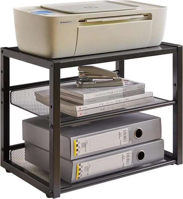 Large capacity storage space: three layers of large capacity design help to store office supplies. The top panel can bear up to 44 pounds. It can hold printers, fax machines, or microwave ovens. The adjustable storage layer is convenient for taking documents. The bottom has adjustable feet to protect the desktop from friction