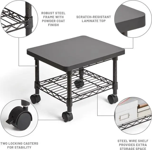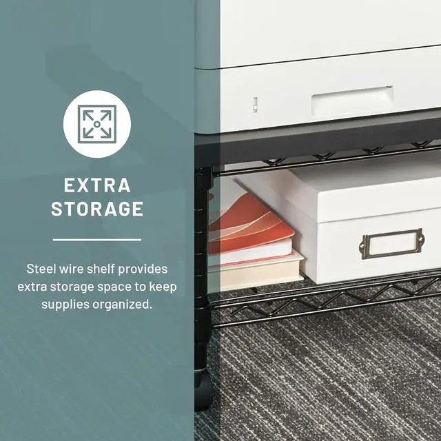 DURABLE ASSEMBLY. The cart' s steel frame provides exceptional stability while the powder coat finish helps resist chipping and scratching for an extended professional appearance. Scratch-resistant laminate top accommodates most office machines.