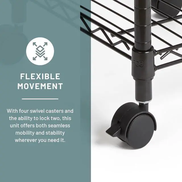 EASY MOBILITY. Four swivel wheels allow easy movement; two wheels lock to keep the stand stable.