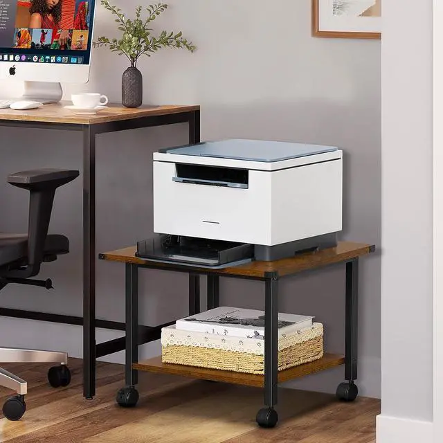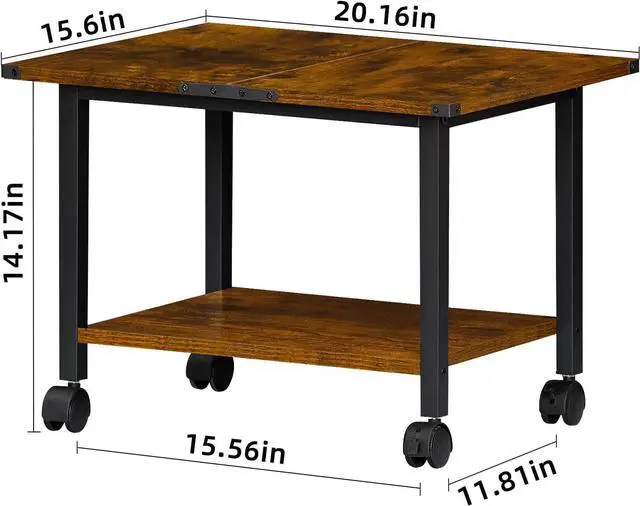 • [Sturdy & Durable] Overall Size : 20.16 "L X 15.6''W X 14.17''H. Metal corners are decorated on the four corners, which is both beautiful and protect the corners of the table. The industrial printer cart is made of sturdy steel tube frame and thick wood boards as support, which can firmly support the items placed on the printer sh