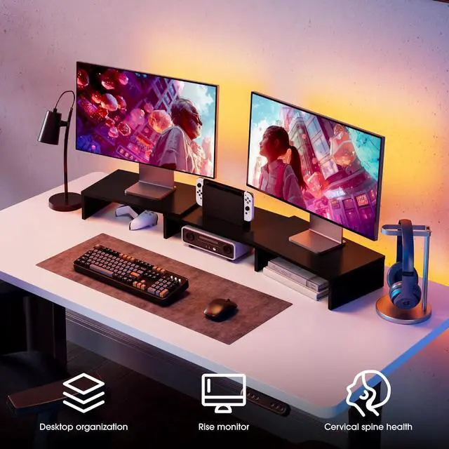 Longer Size with More SpaceAt longest 42.7 inch wide, this laptop riser is big enough to support two monitors. Depending on your setup, you may even have room to place a speaker or another device in the middle. Creates enough space underneath for smaller desk essentials, or to tuck your keyboard and mouse away.