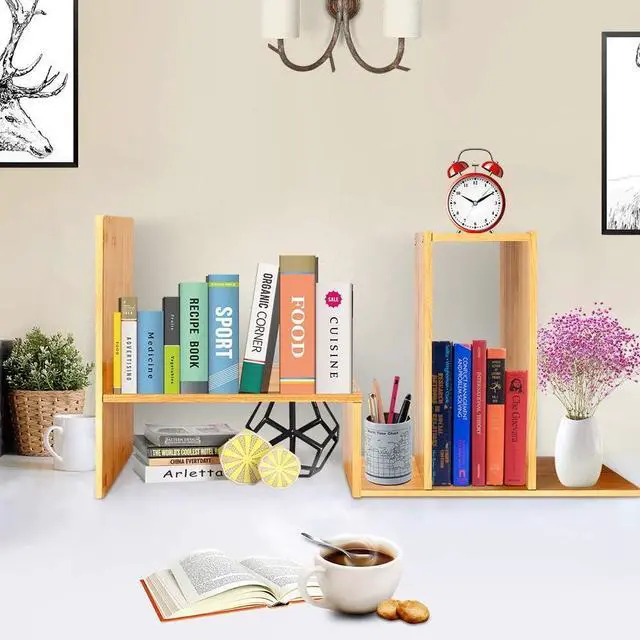 INNOVATIVE DESIGN: Design with sleek irregular shelves; The desktop bookshelf has 2 main parts, the position and the distance between two parts can be adjusted to meet your different storage needs; Maximize use your space.