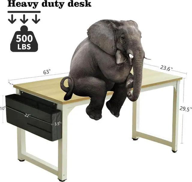 [Large Size ] 63" L x 23.6 W x 29.5 " H The computer desk has got sturdy as heck metal legs that are thick and the wood desktop was shipped in another wooden crate for extra protection. Avoid damage to the desktop during transportation and reduce the hassle of returns and exchanges.