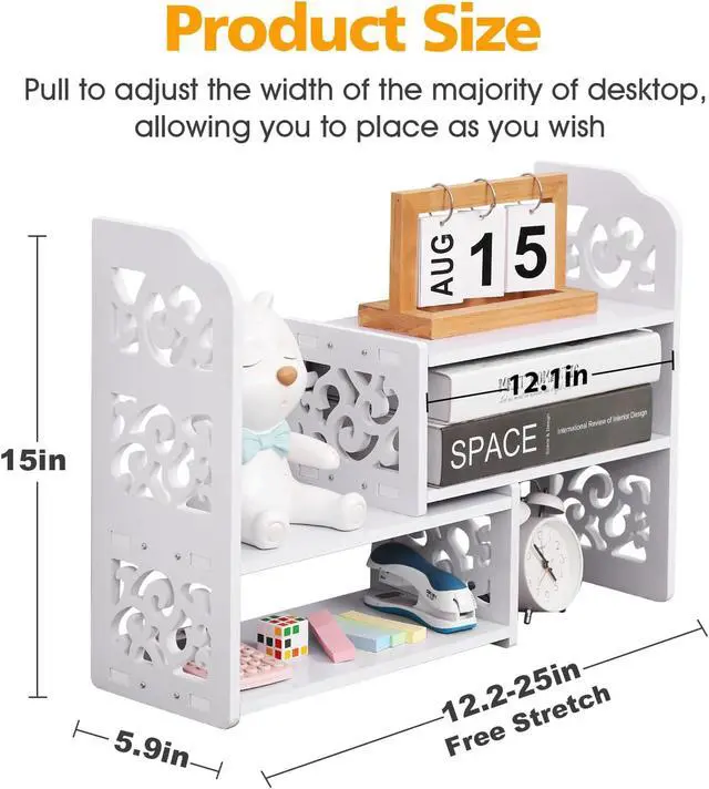 • Shelves for Desk: The various compartments offer enough space for stationery, notes, mobile phones, keys, etc, especially the integrated 3 shelves your itmes are now always within reach and neatly sorted. Dimensions: 6.7"D x 13~25"W x 15.1"H. (Adjustable Size)