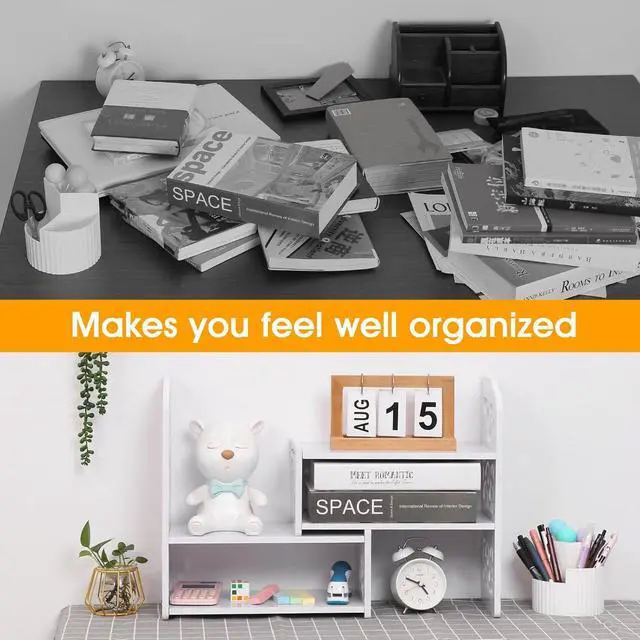 Versatile for Multiple ScenariosWhether it' s your office workstation, study desk, or the limited space in a dorm room, this desktop bookshelf seamlessly fits in anywhere. Its compact design saves space while instantly organizing cluttered documents, books, and stationerycreating an efficient, tidy, and focused environment for you in any setting