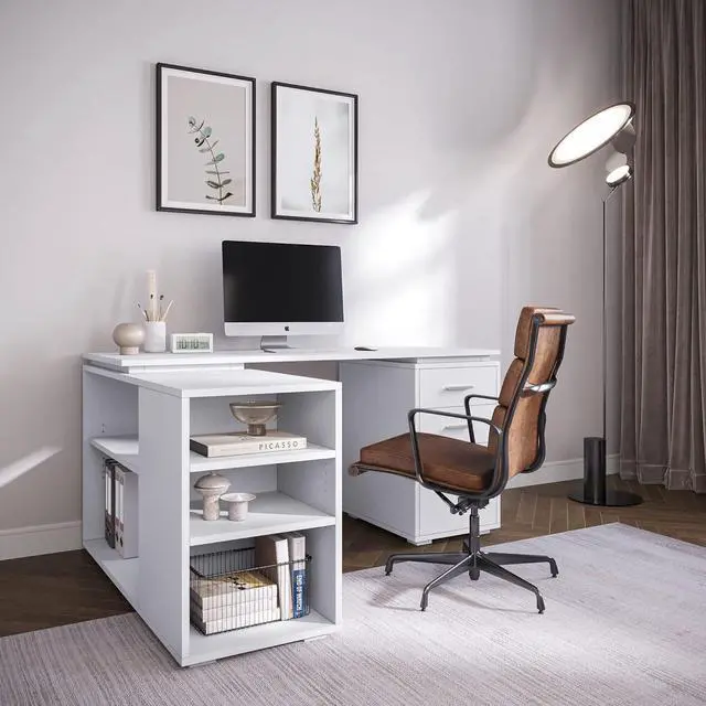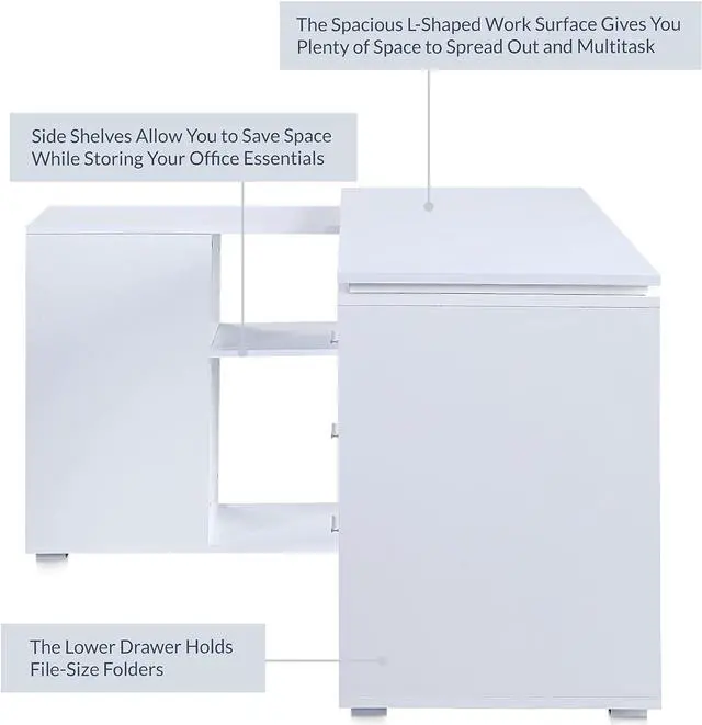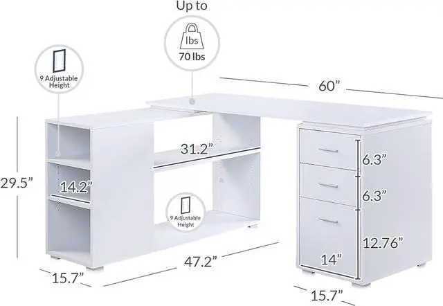 [VERSATILE SETUP] This L shaped desk can be positioned with the L shape facing left or right, so you can decide what best fits your space. The shelves can be adjsuted to suit your knees with 9 heights. Assembly will take under 60 minutes and all hardware is included.