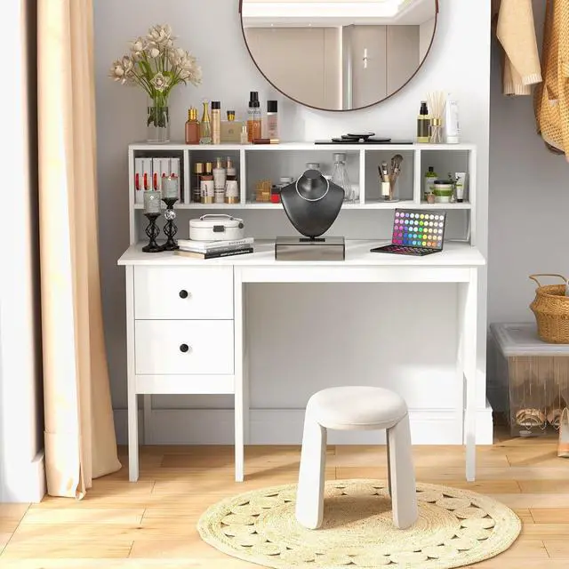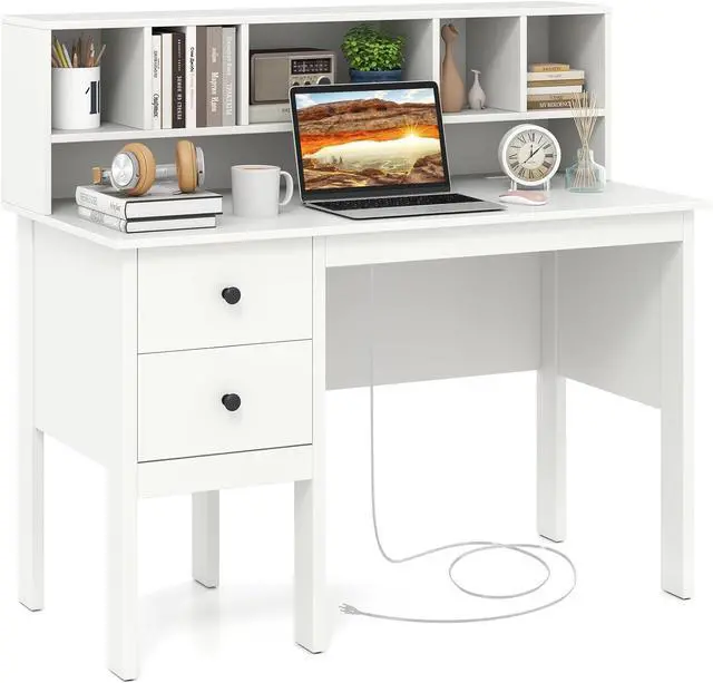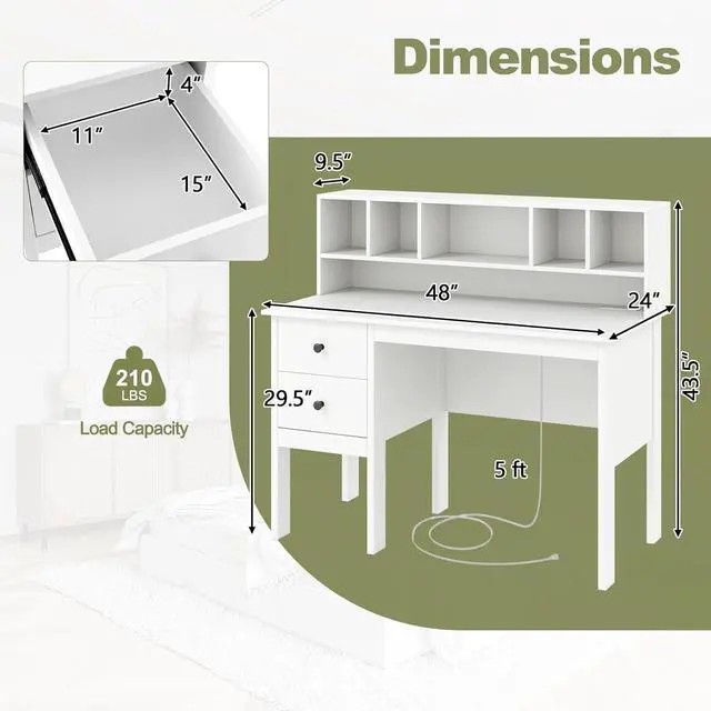 Storage]: Designed with a 48' ' spacious desktop, 2 large drawers and 5 open storage compartments, this home office desk provides you with plenty of space to keep your items organized and easy to access. The overall dimension of our office desk: 48" x 24" x 43.5 " (L x W x H).