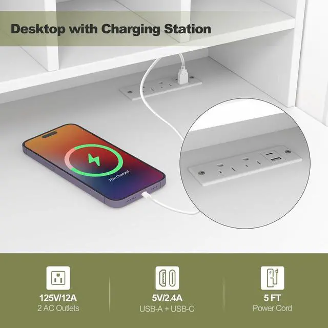 [Desk with Charging Station]: This pc work desk comes with a built-in charging station that includes 2 AC outlets, 1 USB port and 1 type c port for easy charging of your cell phone, computer and other electronic devices, avoiding the hassle of using messy extension cords.