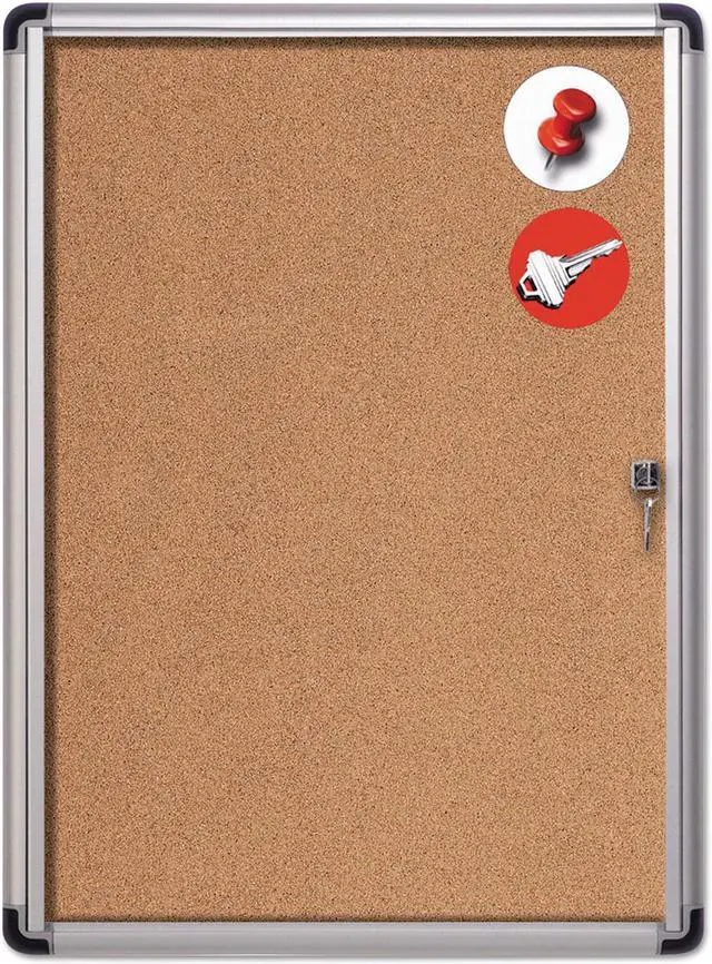 Ultra-slim format allows perfect visibility without any obtrusion into walking spaces. Lightweight and easy to hang. Perfect for menus, schedules, timetables and other vital postings. Cork surface never shows pin holes. Clear acrylic door for maximum visibility with lock and keys. Satin aluminum frame with reinforced corners provides extra durability.