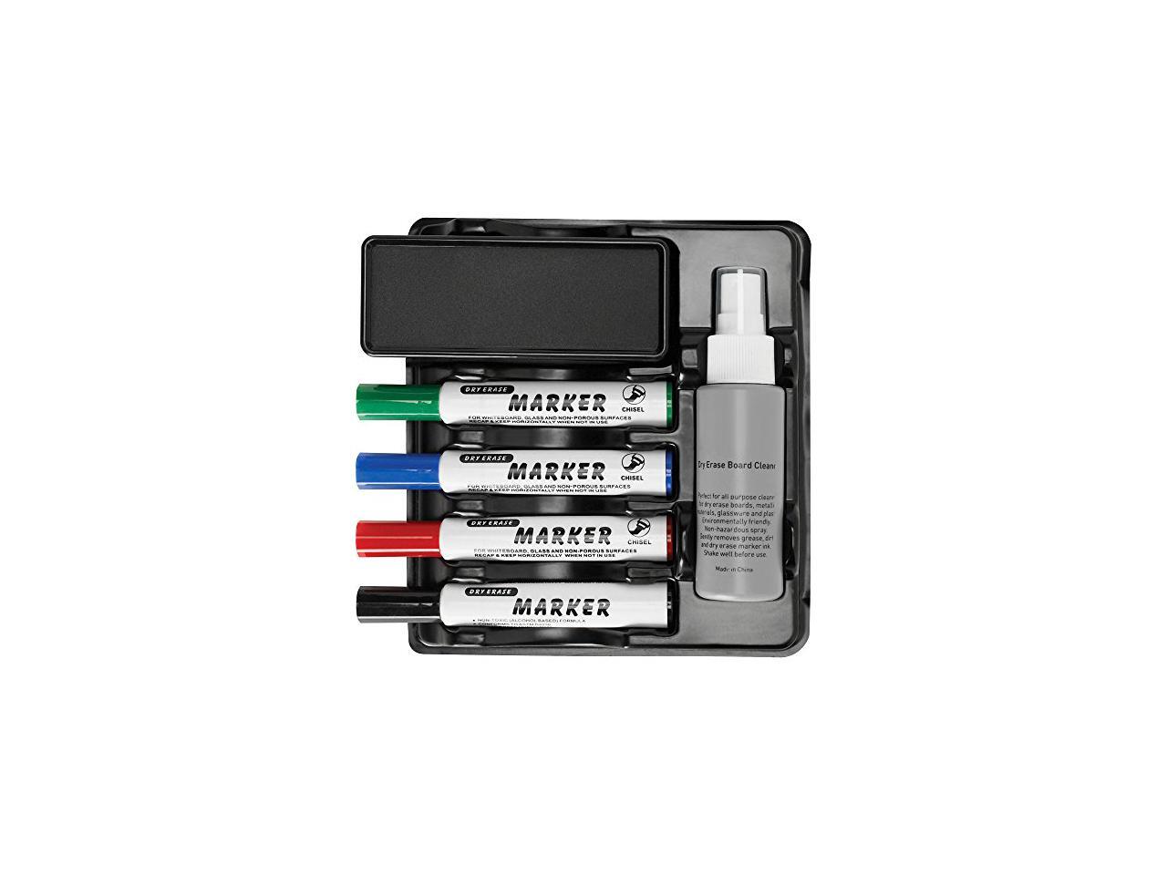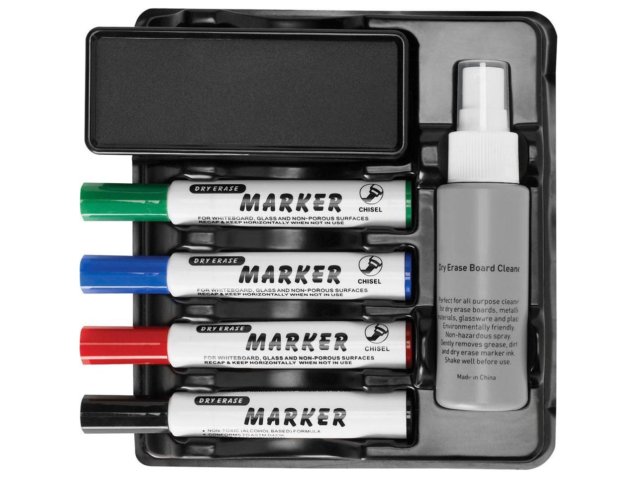 Marker and Eraser Caddy Kit includes four markers, one cleaner and one eraser in a black holder base.