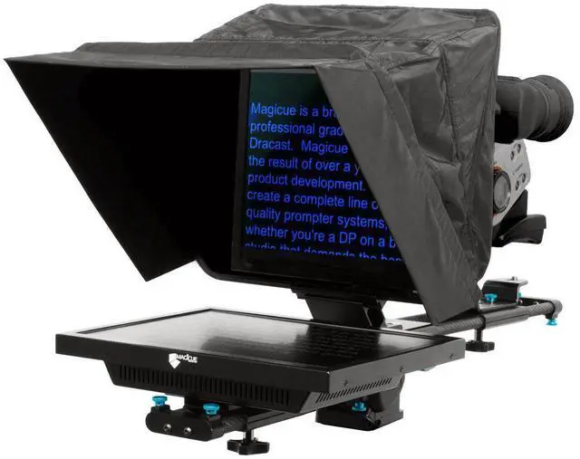 This teleprompter kit is designed to work seamlessly with any standard size tripod that can support the required payload capacity. It includes the Magicue Pro software, a PC/Mac compatible program that is ideally suited for small studio setups and on-the-fly revisions. This software is a key component of the teleprompter package, enhancing its user-friendly nature.