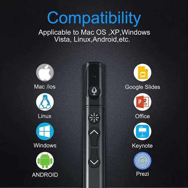 [Universal Compatibility]The slide clicker is optimized to work with Windows, Mac OS, Android and all leading presentation software (including PowerPoint, Keynote, PDF, Google Slides and Prezi). Set your pointer mode with theTIBURN presentation app. Enabled via TIBURN presentation app.