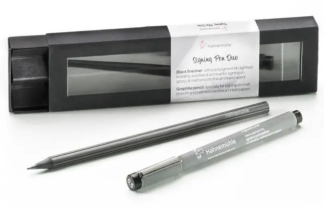 Whether you're signing important documents or adding your autograph to limited edition prints, this pen provides the reliability and finesse that professionals demand. Complementing the pigment liner is the classic graphite pencil, also presented in a striking black finish. This archival-quality pencil is perfect for those who prefer the traditional feel of graphite for their signatures or artistic sketches. Both the liner and pencil are housed in a modern, black Hahnemuhle Signing Pen Duo-Box, making it an ideal choice for artists, collectors, and professionals who seek to add a distinctive and high-quality touch to their work.