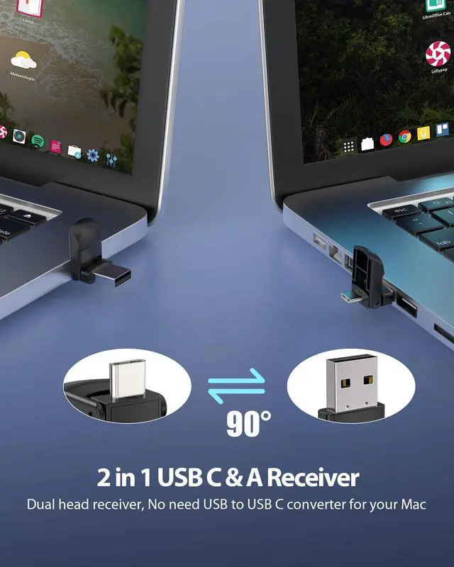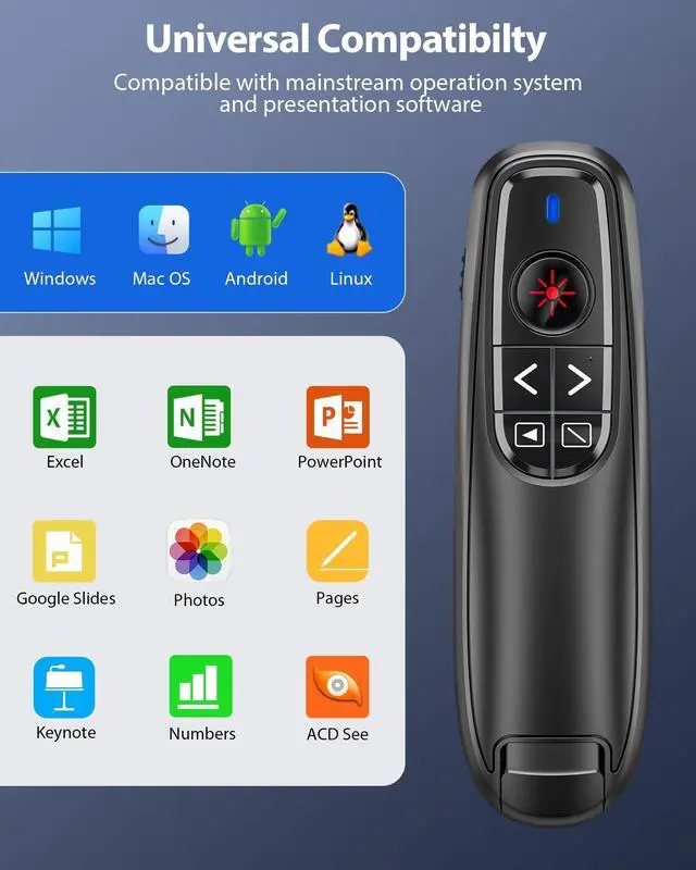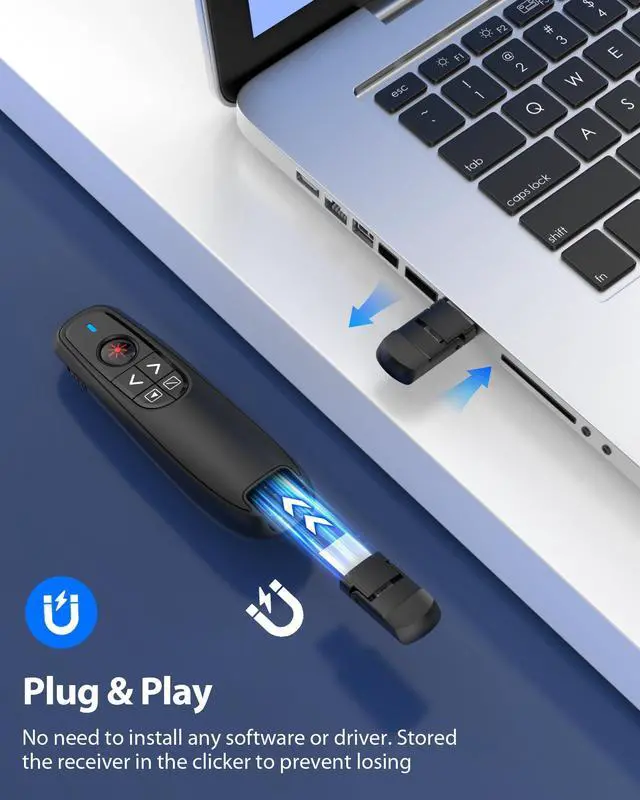 2-IN-1 USB TYPE C RECEIVER & PLUG AND PLAY: Designed with 2-in-1 USB and TYPE-C connector, the wireless computer clicker for presentations is plug-and-play. No software is required to install. You need 1 AAA battery installed into the wireless presenter remote to power it. The USB C receiver is stored in the remote clicker for presentations to prevent lossing. Adopted RF 2.4Ghz technology to maintain the steady signal reception.(NOTE: The AAA battery is not included in the package)