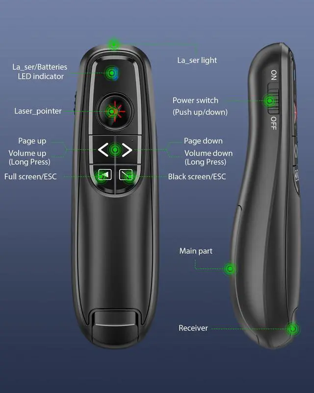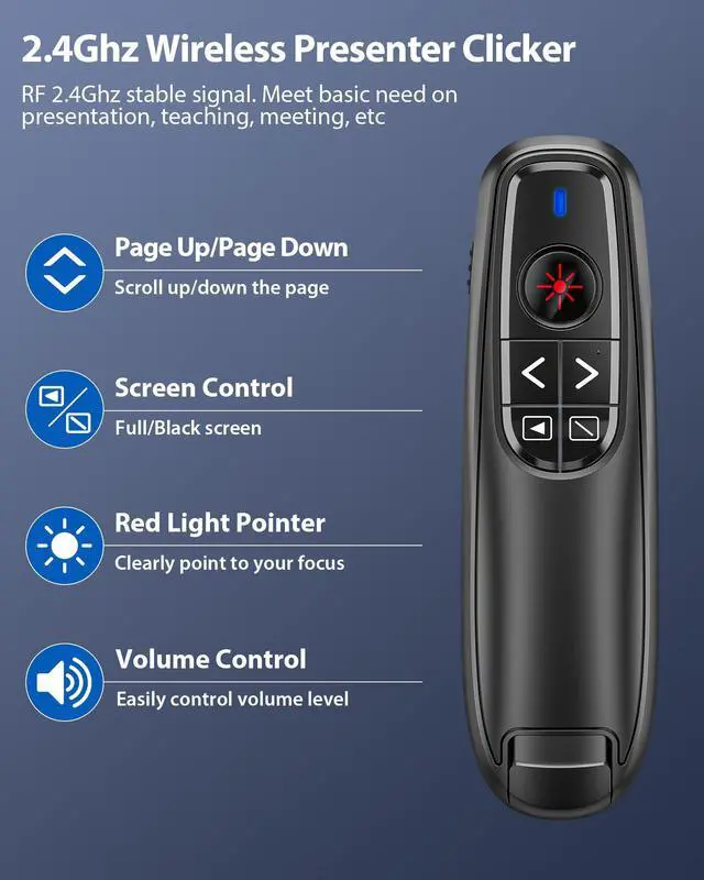 INTUITIVE PRESENTATION POINTER WITH VOLUME CONTROL: This classic presentation remote meets the classic demands of red pointer,page up,page down,full screen,black screen and volume control. This power point remote clicker help you gain more confidence in your teaching,coaching,speeching,meeting or conference presentations, and this laser pointer for presentation also works as a cat chase toy to entertain your pets with the bright red light