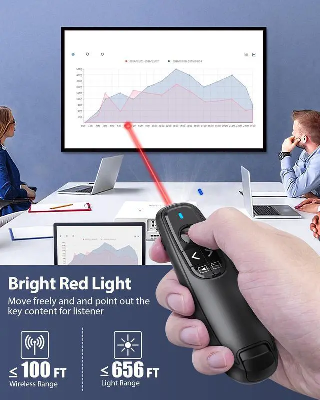 BRIGHT RED LIGHT & LONG RANGE CONTROL: Use this slide advancer with pointer to highlight and point out the key part to for audience with its bright red which is easy to be seen clearly against most background(Not recommended for TV/LED/LCD screens). The wireless remote control distance is up to 100ft and the red laser distance is up to 656ft, this computer clicker allows you to enjoy the freedom to stroll around and mingle with your audiences for greater impact in a large space