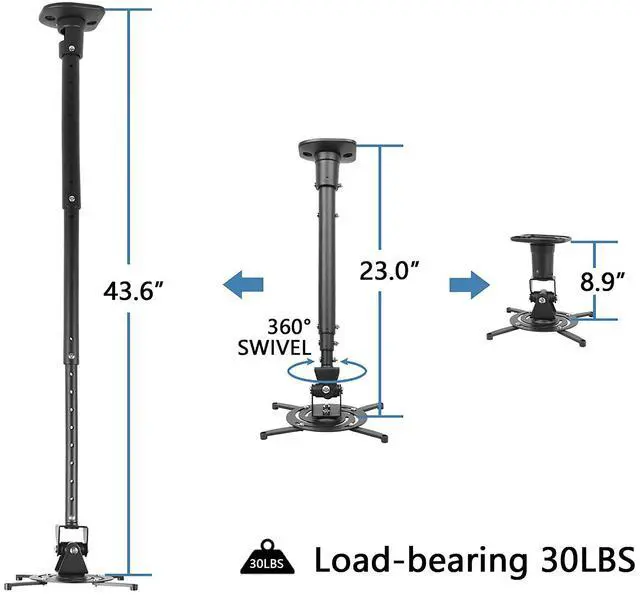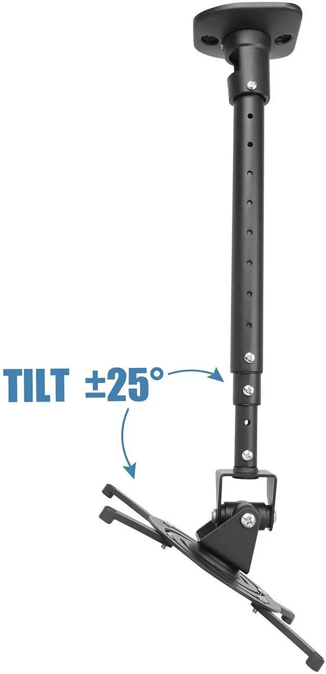 The mount provides a 23-inch to 43.6-inch extension and collapses to 8.9-inches from the ceiling