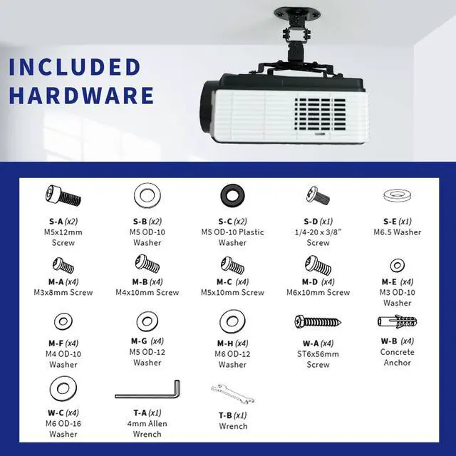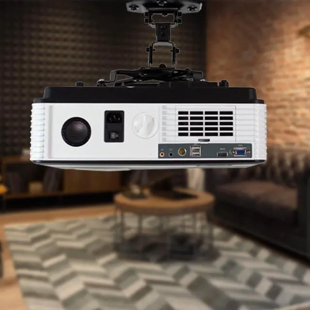 Fully adjustable projector mount featuring 15-degree tilt, 15-degree swivel, and 360-degree rotation, hitting all the right viewing angles. The bolts can be tightened and loosened with the provided hex tool for flexible movement or securing in position.
