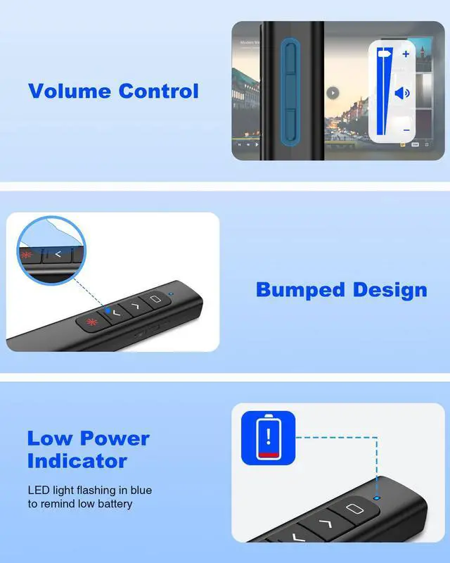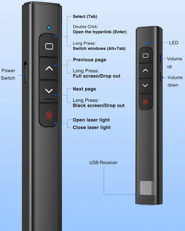 Multifunctional Wireless Presentation ClickerThis slide clicker supports page up/down, full screen/black screen, volume control (+/-), window switching, and hyperlink activation all with 4 intuitive buttons. Perfect for PowerPoint, Keynote, Prezi, and even Excel/Word demos toggle between slides, dim the screen for focus, or adjust video volume mid-presentation without returning to your desk