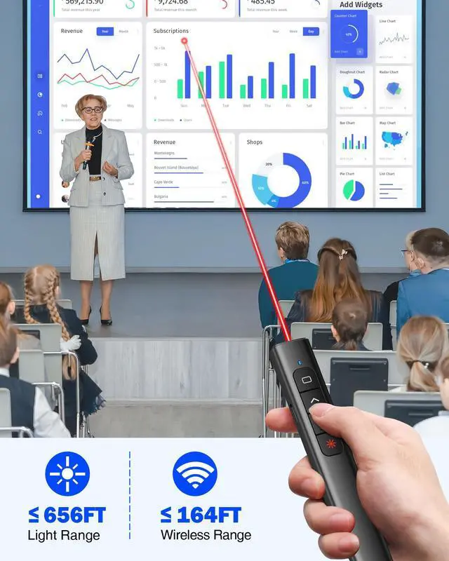 100ft Wireless Range for Freely Moving Presentations The wireless presentation remote offers a stable 100-foot wireless range, letting you step away from the podium, engage with the audience, and control slides seamlessly in classrooms, auditoriums, or conference rooms, making lectures and meetings more interactive without signal drops