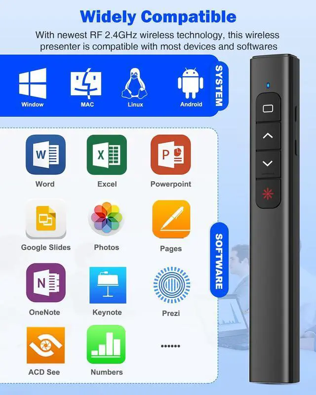 Wide Compatibility with Most Devices & Software The PPT remote works seamlessly with Windows 7/8/10+, Mac OS 3+, Linux, and Android 4.3+, supporting PowerPoint, Keynote, Prezi, Google Slides, and web page scrolling (Chrome/Firefox), with dual USB-A/C receivers eliminating adapter hassles for all your presentation devices