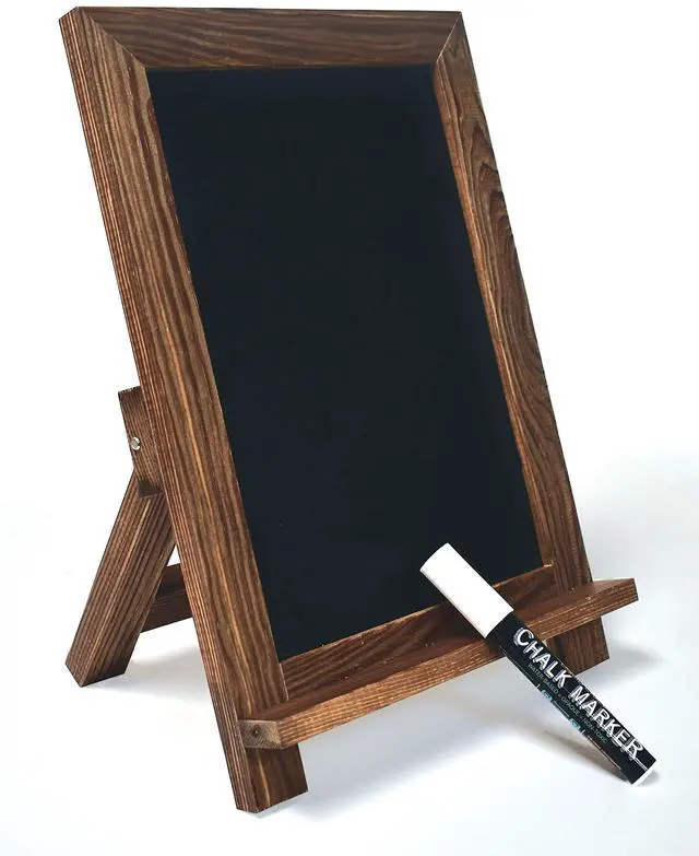 Framed Tabletop Chalkboard Sign, 9.5" x 14", Rustic Wood Frame, Small Magnetic Chalkboard, Built-in Ledge and Folding Stand, One White Chalk Marker Included, (Rustic Brown)
