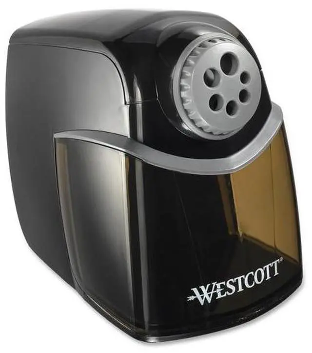 Heavy-duty sharpener features a helical, 12-blade cutter for incredibly fast sharpening. Auto-stop technology prohibits you from oversharpening your writing utensils to prevent wasteful use. Extra-large shavings reservoir holds more at once to minimize trips to the waste basket. Quiet operation prevents you from distracting others in quiet settings. Safety shutoff halts the motor when the shavings reservoir is removed for safe use. Adjustable dial accommodates up to six different pencil sizes. Sharpener is perfect for all school, home and office uses.
