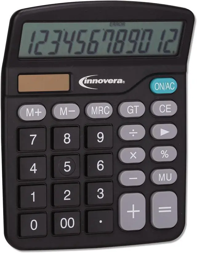 Ideal for everyday calculations, this desktop calculator adds up to a great office essential. Dual solar/battery power provides reliable functionality in all lighting conditions. Angled display prevents overhead glare and eyestrain. 12-digit display for basic calculations. Power Source(s): Battery; Solar; Display Notation: Numeric; Number of Display Digits: 12; Display Characters x Display Lines: 12 x 1.