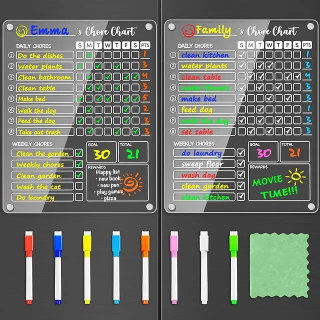 Yes, the acrylic chore chart is easy to clean thanks to its smooth, non-porous surface. For dried ink, a damp cloth works best. With regular cleaning, it won’t stain or leave residue.