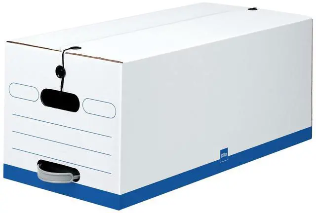 A quick, simple setup saves you time! Office Depot boxes with string & button closures are excellent for holding all types of papers and office supplies. When time is of the essence and you have to get supplies in storage, these boxes are up to the job. Office Depot recycled storage boxes with string and button closures keep contents secure. Each box features built-in handles that allow for easy moving. SFI certified. Contains Recycled Content - See Specs for
