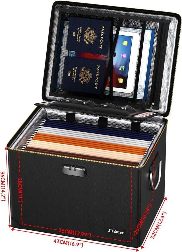 Large Organized Storage: With exterior dimensions of 16.9 " x 12.6 " x 14.2 " (interior: 12.99 " x 10.24 " x 11" ), this fireproof box is specifically designed to accommodate letter-size files (but is not suitable for legal-size files), while providing ample space for photos, passports, and important documents. Its versatile design serves as both a secure file cabinet and emergency organizer, offering reliable protection for home or office use. The generous capacity maintains full compatibility with standard filing systems while ensuring easy organization of your valuables