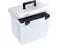 Create a quick & easy portable file system; this slightly translucent plastic file box has a hinged lid with double latches; file rails hold up to 22 folders; includes 3 hanging files, tabs & inserts