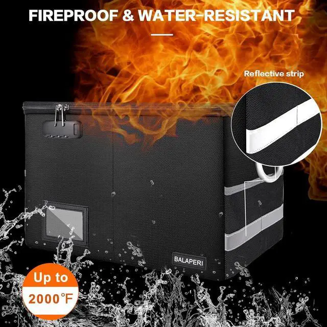 Fireproof File Box: The exterior material of BALAPERI Fireproof Document Box is made of upgraded silicone coated fiberglass, which can withstand temperatures up to 2000and has been passed the SGS TEST (UL94 VTM-0 Certified). Its also highly water resistant, so you don' t have to worry about your files getting wet by rain. The design of the reflective strip on the side allows you to find it immediately even when you' re in the dark.
