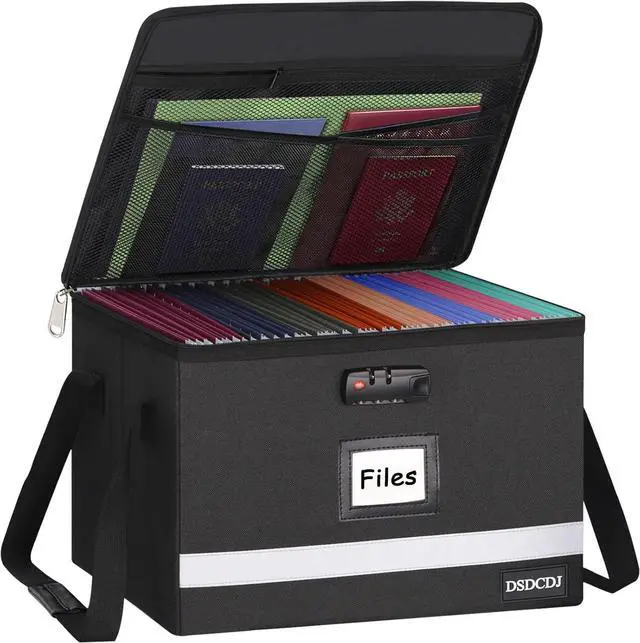 Large Capacity: This file organizer box measures 15.5 " x 12.3 " x 10.5 " and fits both Letter and Legal size documents, as well as your hanging folders, important document, passports, certificates, USB drives, photo albums, and other valuables. The inside of the file box lid features 3 passport mesh pockets and a large zippered mesh pocket for additional storage. Stay organized and keep your essentials secure with this versatile portable file box with handle