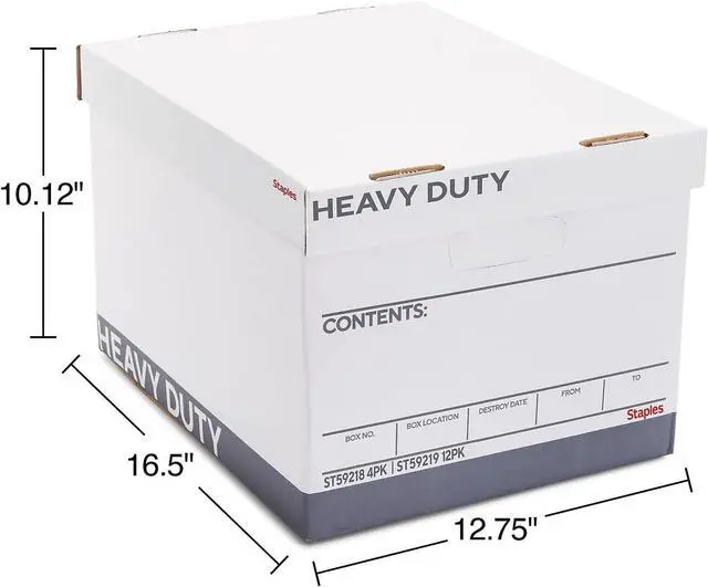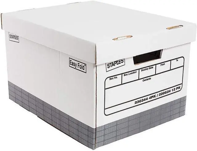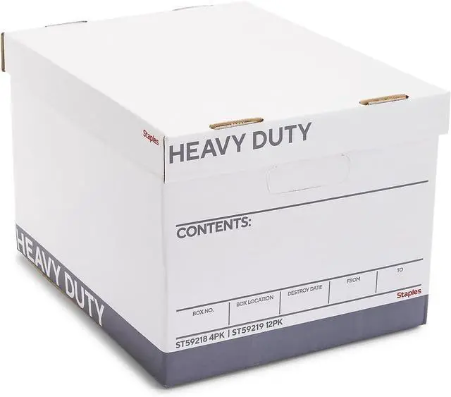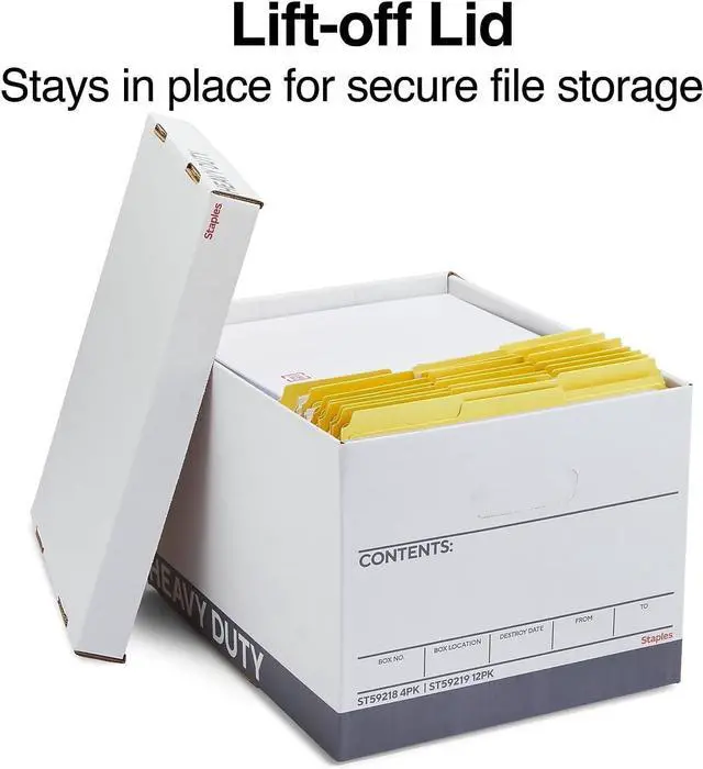 STAPLES Storage & Filing Box, Heavy-Duty with Handles & Removable Lid, Letter & Legal Size Documents, Stackable, 4-Pack, White/Gray