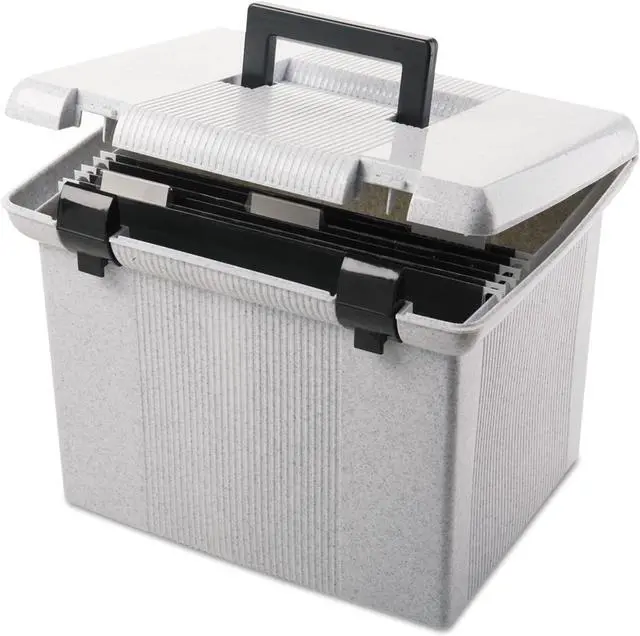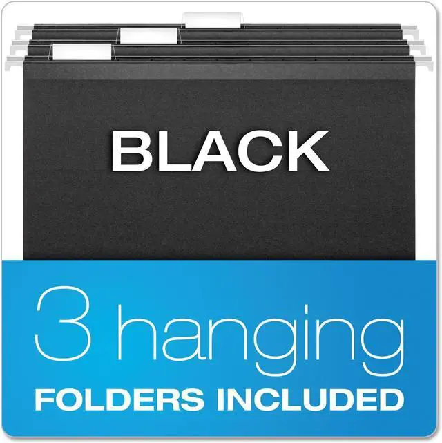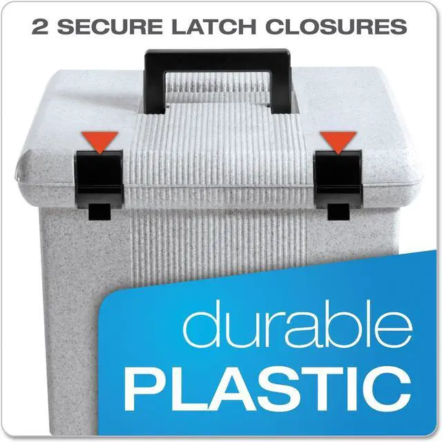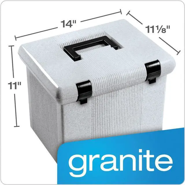 Sold as 1 EA Lightweight plastic hanging file box provides carrying ease; self-locking lid keeps contents secure. Includes three Pendaflex letter size hanging folders with tabs and blank inserts. Recessed handle folds down for storage.