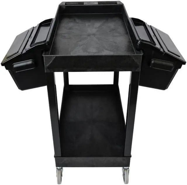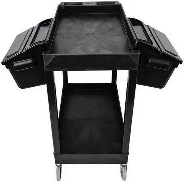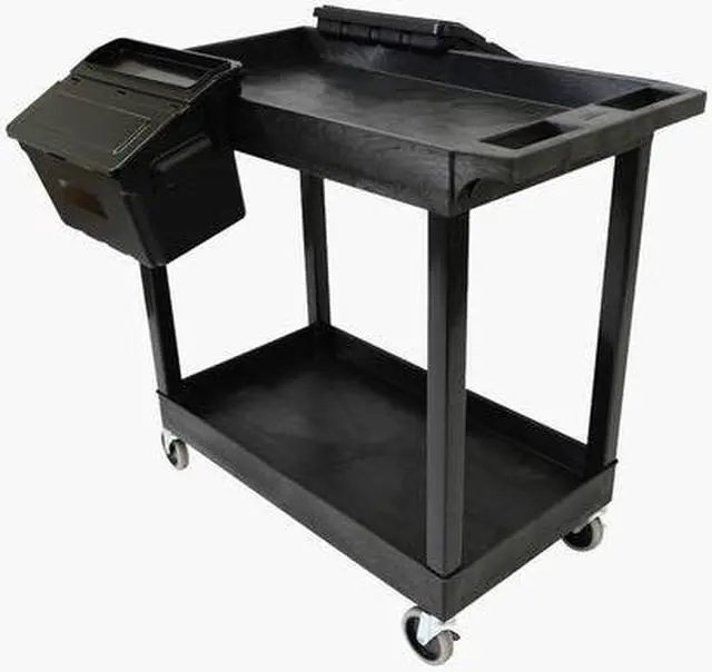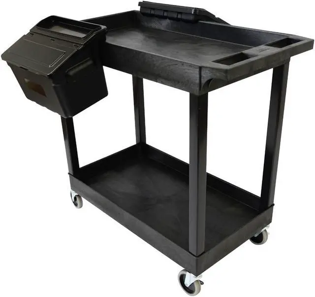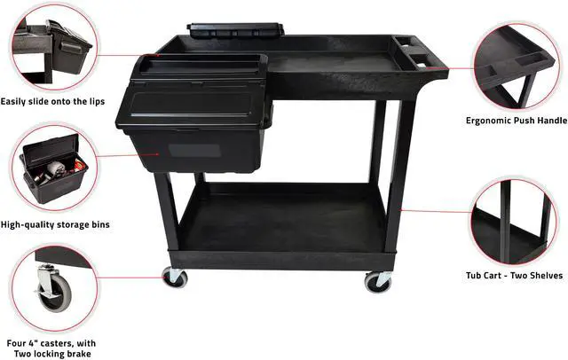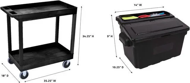 With two large tub shelves that are 2.5" deep, this multipurpose utility cart easily holds and hauls a wide range of items and is designed to carry loads up to 200 lbs. The tub shelves are made of a high-density polypropylene, known for its incredible strength-to-density ratio, which assures that each cart is durable without being bulky or cumbersome. Easily guide the cart across indoor and outdoor environments using the ergonomic push handle and full-swivel casters; simply engage the two locking brakes when you need to keep the cart stationary. Two tub shelf cart suits warehouses, shops, garages, cafes, or offices. Molded plastic shelves and legs will never rust, dent, scratch or stain. HDPE (high-density polyethylene) shelves; PVC legs. 33% more capacity than standard 24"W x 18"D carts. Shelves safely transport goods in 2.5"-deep tub area.